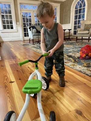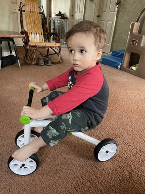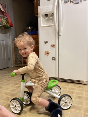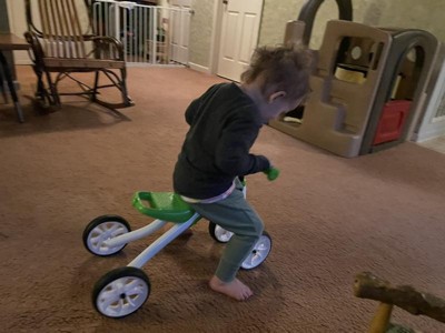 I bought this Chillafish Quadie (green) in very cold January 2021 while I was housesitting for my folks & my at that time 1.9 year old needed something more to do inside. Everything about this product was really cool right from the start… The box/packaging, instructions & easy assembly. My guy even ‘helped’ me put it together. He didn’t really get riding it, but would at first sit and smile & eventually got the whole concept about a month later. We’ve moved the seat one time to accommodate his growth & at 2.5yo now- he’s a pro at riding his Quadie. He says ‘I go so fast’ lol. It’s so nice to have for an inside toy & really helps get extra energy out particularly on days it’s too hot, too cold, too rainy, too mosquito-y outside. He uses the seat compartment for a wooded orange but mostly leaves that part closed & alone. Steering is so effortless for him- almost ‘zero radius’ turns. We look forward to when he’s ready for a trainer bike to ride outside on the flat of our wooded bike trail. But for now this Quadie is just perfect & it seems like he’ll be riding it for a long time still- it’s such a great size & the grow with me feature of the seat, sturdy frame & wheels & turning handlebars make this worth every penny spent. I seriously researched, compared & & deliberated on which trike to purchase and longevity was a big issue most others couldn’t meet my expectations- but this Chillafish Quadie has been absolutely perfect. I 100% suggest you purchase one for your lil one