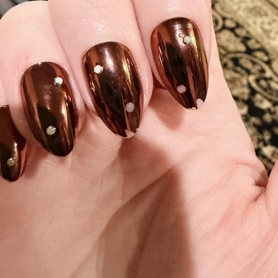 These are the worse quality press ons I’ve used. I put them on and by the next day the chrome was peeling off and the dots on the nails had fallen off. Don’t make the design if you can’t execute it well in my opinion. Would not recommend, especially for the price!