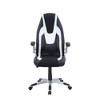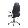 This black and white faux leather upholstered, 360 swivel chair features ergonomic gas-adjustable height, foldable arms and a breathable fabric seat front for leg comfort, with hooded dual-wheel nylon casters on the base for smooth, jam-free mobility.