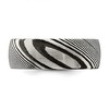 This stylish 8 mm wedding band combines a polished finish with a striking black accent. Made from durable Damascus steel, it features a comfortable standard fit and a half-round shape with flat edges for a contemporary look. Perfect for a modern wedding band with a unique touch
