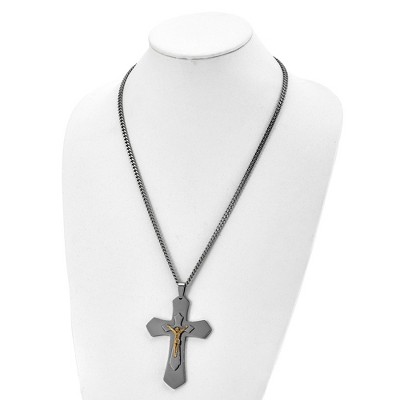 Bold and eye-catching, this men's themed necklace features a polished stainless steel curb chain with rich gold-tone IP plating. The 24-inch chain is paired with a textured themed pendant, measuring 50mm by 40mm, for a statement look. Finished with a secure lobster clasp and durable construction, this necklace is perfect for daily wear or special occasions.