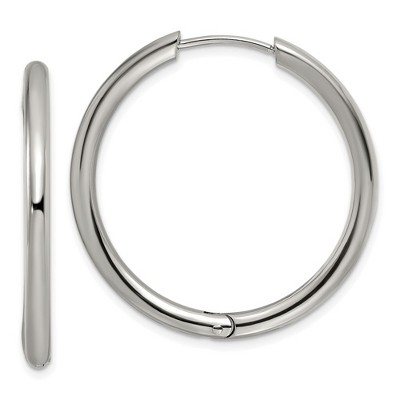 These polished stainless steel hoop earrings measure 13 mm in length and width, with a thickness of 3 mm. Sold as a pair, they feature a hinged/huggie style with a post, notch, and lock closure for a secure fit. Their compact and sleek design offers a stylish yet comfortable wear, perfect for daily use or dressing up.