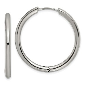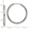 Elevate your look with this pair of 35mm polished stainless steel hoop earrings. Featuring a sturdy 3mm thickness and a comfortable hinged/huggie style with post, notch, and lock closure, these earrings offer both security and style. Perfect for everyday wear or special occasions, they blend modern design with lasting durability.