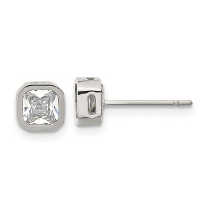 These elegant stud earrings feature two sparkling white synthetic cubic zirconia stones set in polished stainless steel. With a compact 6mm length and 5mm width, they offer a classic look secured by friction & push-back closures