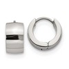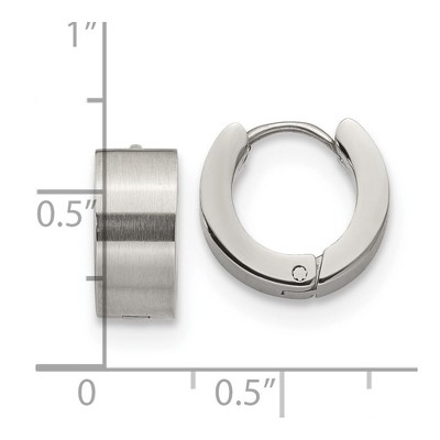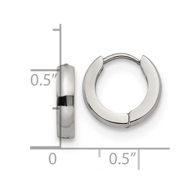 These polished stainless steel huggie hoop earrings offer a sleek, contemporary look in a compact size. Measuring 13 mm in both length and width with a 7 mm thickness, they’re perfect for everyday wear. Featuring a hinged design with a secure post, notch & lock closure, these earrings are sold as a pair and designed for comfort and durability.