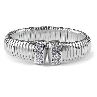 Add a modern sparkle to your look with this elegant brushed-finish bangle bracelet. Measuring 7.5 inches in length and 2 mm in width, it features a sleek, slip-on design with no clasp for easy wear. The bracelet is accented with a synthetic round white cubic zirconia—expertly crafted for brilliance—set in a 34 mm by 12 mm charm element. Contemporary and refined, this bangle offers the perfect blend of minimalist design and subtle shimmer, ideal for everyday style or evening wear. Metal Weight 6.78 gram.