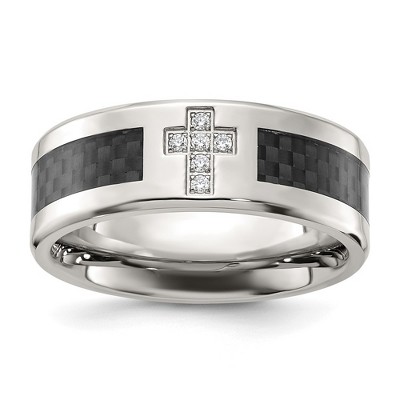 This bold and contemporary wedding band is crafted from durable stainless steel and features a sleek polished finish with a striking black carbon fiber inlay. The 8 mm wide flat band is enhanced with six round white cubic zirconia stones, each 1.5 mm in size, prong-set to provide brilliance and refined detail. Designed with beveled edges for added dimension and a modern profile, this ring blends strength, style, and sparkle—perfect for a distinctive commitment piece