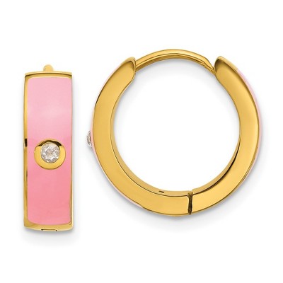 Add a touch of elegance with these polished gold-tone hoop earrings crafted from durable stainless steel. Featuring vibrant blue enamel accents and two sparkling white synthetic cubic zirconia stones on each earring, these hoops measure 15 mm in length, 5 mm in width, and 2.5 mm in thickness. Designed with a secure post, notch, and lock closure, they offer both style and comfort for everyday wear.