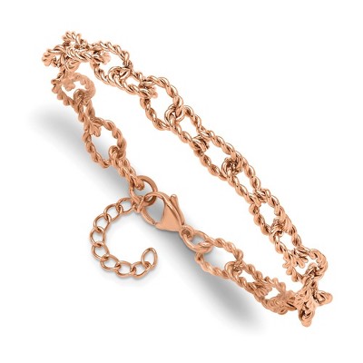 Add elegance to your wrist with this Rose Tone IP-Plated Stainless Steel Bracelet featuring a sleek, polished finish and sparkling white synthetic Cubic Zirconia accent. Designed with a 3D reversible element, this 7-inch fancy bracelet includes a 1.5-inch extender for the perfect fit. The durable stainless steel construction and lobster clasp provide strength and security, making this bracelet ideal for daily wear or special occasions.
