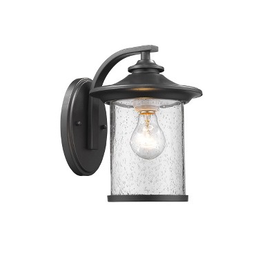 The Chloe Lighting Transitional outdoor wall sconce offers timeless style with durable functionality. Each of the two fixtures stands 9.8″ high × 5.63″ wide × 7.63″ deep, with a clear seedy glass shade encased in a powder‑painted black steel frame. Designed for wet‑rated, all‑weather performance, this hardwired, UL‑listed sconce is ideal for flank lighting beside garage doors, entryways, patios, or porch areas. The seeded glass gently diffuses light for a warm, welcoming glow. The down-oriented open bottom design ensures effortless lamp changes (bulbs not included).