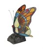 Delight in nature-inspired artistry with the Jacy 2 Tiffany-style butterfly accent lamp. This exquisite handcrafted piece captures a butterfly gently perched atop a rose, brought to life with vibrant stained glass and fine detailing. Composed of 60 individual hand-cut glass pieces and 4 colorful glass beads, the butterfly's wings radiate color and charm under soft illumination.