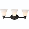 This is a wonderfully simplistic design of a bathroom vanity light fixture. The soft colors of the etched white glass shade on the rubbed bronze finish bar is is just the piece your restroom needs! This fixture can be installed with the lights facing upwards and downwards. Also the open, bell shades, are the cherry on top, allowing easy lightbulb changes. This fixture takes three 100W E26 bulbs, and is compatible with flourescent, incandescent, and LED bulbs. This fixture is damp listed and UL listed.