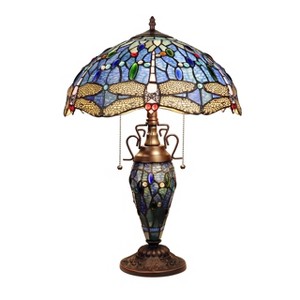 This is a Dragonfly design 3 light, Tiffany-style double lit table lamp that would be a perfect fit in a bedroom, office and livingroom! The shade is hand-crafted, using the same methods developed by Louis Comfort Tiffany in the early 1900's. This process entails using 339 hand cut stained art glass pieces and 123 glass beads, each wrapped in fine copper foil and soldered together at extremely high temperatures to form each unique piece. Exact size to the nearest inch may vary, and exact color of each glass piece may vary due to each piece being hand crafted. First image is with the light shining through, second image is with no light. Dry listed and recommended for an indoor setting.