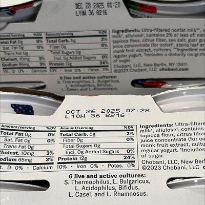 ultra-filtered nonfat milk**, water, skim milk (a), allulose (a), contains 2% or less of: natural flavors, tapioca flour, citrus fiber, sea salt, guar gum, stevia leaf extract (reb m), monk fruit extract, cultures. ** ingredient not found in regular yogurt, (a) includes a dietarily insignificant amount of sugar.