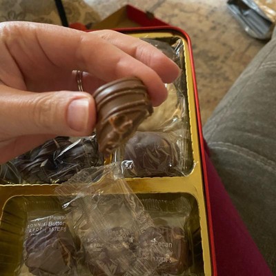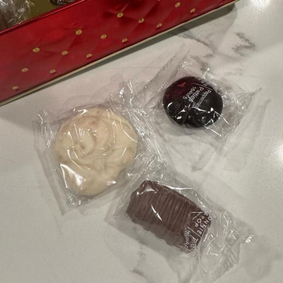 [This review was collected as part of a promotion.] I purchased this box set of holiday chocolates online. I purchased this to serve at a gingerbread making party at my home. Let me first start off with the positives of this deluxe chocolate gift tin. This box is filled with over a pound of beautiful gourmet chocolates. There is a variety of shapes and flavors, including chocolate covered pretzels, peppermint patties, peanut butter squares, English toffee, sea salt caramels and more. I sampled several of them and the sea salt caramel were probably my favorite. The chocolates come individually wrapped and are stored nicely in a red tin gift box. I purchased two of these tins - one to serve at my party and one to give as a gift. Now, the downside to this package. Almost every single piece of chocolate arrived melted inside of its plastic wrapping. For the price of this box, I would have expected better quality. If this was a shipping issue, I would expect target to send them with expedited shipping to avoid this issue.