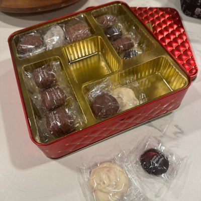 Chocolate Christmas Gift – Gourmet Holiday Tin with Assorted Chocolates & Caramels in Red Tin