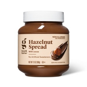 You'll love to indulge in the perfect sweet treat — from breakfast smoothies to afternoon snacks to anytime desserts — with the Hazelnut Spread with Cocoa from Good & Gather™. Sweet, buttery hazelnut and smooth, rich cocoa come together to create an irresistible spread that’s simply waiting to be savored up. It's even made without any artificial sweeteners for added peace of mind! For a delicious start to your day, add a spoonful or two of this hazelnut spread with cocoa to a smoothie packed with bananas, frozen berries, your choice of milk and yogurt, and toss in some fresh spinach and flax seeds for extra goodness. You can even spread it onto toast for a quick and yummy on-the-go breakfast, lather onto a crusty bread with sliced strawberries and powdered sugar for a mouthwatering afternoon snack, or use as a frosting or filling in a variety of baked goods. No matter how you enjoy it — even if you go minimal and eat a spoonful right out of the jar — you’ll love trying new ways to satisfy your sweet cravings with this hazelnut spread with cocoa.