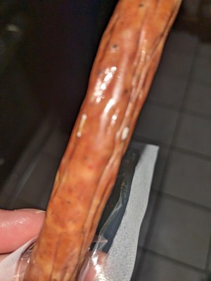 Several of the sticks in the package I received had white fuzzy stuff growing out of them, which appeared to be white mold. The package was still well within date with several months before it is was to expire. It was quite gross to discover more than halfway through the package since I was confident I wouldn't have to look out for spoilage on an item well within the date it should still be edible. I've eaten multiple of these sticks without looking for spoilage and may have eaten some that also had white mold growing out of them 🤢 For reference I purchased the multi pack of the beef taco flavor.