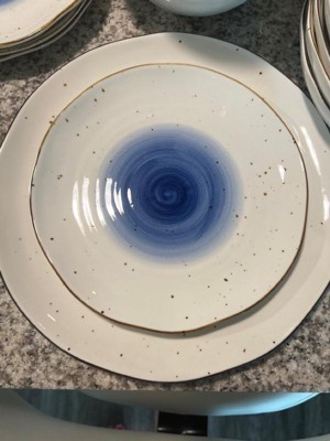 [This review was collected as part of a promotion.] Love this dinnerware set! The ridges, uneven edges and splatter pattern give it an organic and loose feel, but the edging and blue ground it with an unexpected bold elegance. I’ve run it through out dishwasher and it comes out perfectly every time. Biggest highlight: the low bowls! Perfect for salads or pastas and just the right size.