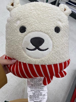 Accent your living space in charming seasonal style with the Christmas Bear Throw Pillow from Wondershop™. This faux-shearling throw pillow is designed in the shape of bear in white with a red striped scarf for a fun, festive look. Boasting a soft recycled polyester exterior and polyester filling for plush comfort, you can display it alone or arrange it with other Christmas-themed pillows.