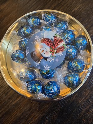 Christmas Candy Gift Tin with Chocolate Lindor Truffles by Lindt Large Plastic Tin with Sticker By Just Candy - Snowman