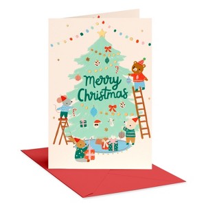 - Design & Finishings: This adorable Christmas card features whimsical critters decorating a festive tree, ideal for spreading holiday cheer.