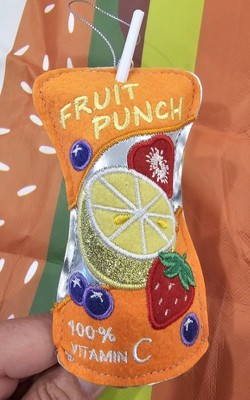 Add fruity flair to your Christmas tree with this Christmas Fabric Fruit Punch Ornament from Wondershop™. Made of polyester, this Christmas ornament is designed as a fruit juice pouch in orange and silver colors. It also features lemon and berry images plus embroidered "Fruit Punch" text for a refreshing feel. Designed for indoor use, it also has a built-in top loop for easy hanging from your tree's branches.