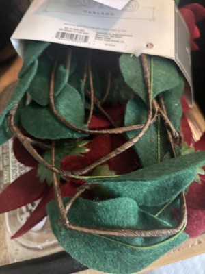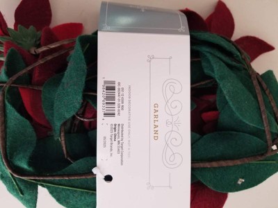 This garland is titled as a "fabric" garland on the Target website. The fabric is actually felt. The garland is 6 ft long. The felt leaves and pointsettias are entwined in a brown wire for easy adjusting - loops on each end for hanging. The green leaves are backed by wire and are easily adjusted and bent. The pointsettia flowers are easily adjusted, however the individual "petals" of the pointsettias are NOT backed with wire and can NOT be bent or adjusted. If purchasing in the store you can choose a garland that is pleasing to your eye. However, if you are ordering through the mail there is a possibility that the felt pieces may be folded due to packaging. Mine had a few folds but nothing too bad. The overall look of this garland is pleasing.