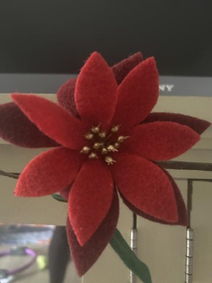 My first impression of this Christmas poinsettia garland is that it is absolutely gorgeous. The felt flowers and leaves are really arranged beautifully. The overall length is perfect for me to use on our console table, or to hang on an accent wall. I do wish that the strand was not made of wire. It is really difficult for me to get in into the position I was trying to achieve. And I already have one area that the wire seems to have broken.