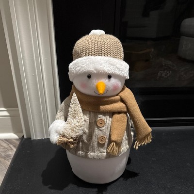 Capture the spirit of the snowy season with this Christmas Fabric Snowman Decor Pom Hat from Wondershop™. Made from polyester fabric, this decorative figurine is shaped like a white snowman with a smiley face, black beady eyes and a yellow carrot nose. It's wearing a beige sweater, brown scarf and white pom-tipped brown hat while holding a natural cream-colored Christmas tree with a burlap sack base, all ready to warm your holidays. Display it alone or paired with other festive favorites on the mantel, any tabletop or shelf to fill the space with seasonal delight.