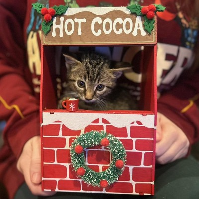 A: The cocoa stand features an open-brick design in red, enhancing its festive appearance.