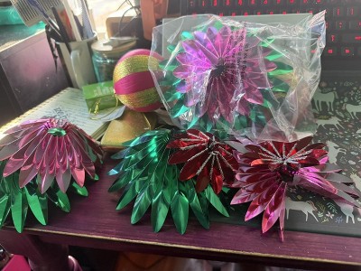 I have fallen in love with these foil flower ornaments. They remind me of vintage reflectors.