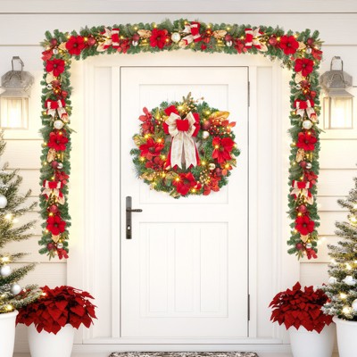 Christmas Garland with Bows & Ornaments, 6FT Red Gold Pre-Lit Garland, LED Lights for Mantel & Staircase Decor