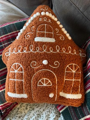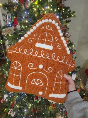 Infuse festive holiday magic into your home with this Christmas Gingerbread House Throw Pillow from Wondershop™. Shaped like a Christmas gingerbread house, this novelty plush pillow showcases a brown surface accented with white detailing for an authentic look. The decorative pillow has a fuzzy faux-shearling exterior and padded interior to offer a plump feel, and you can display it solo or arrange it on a couch or armchair with other accent pillows.