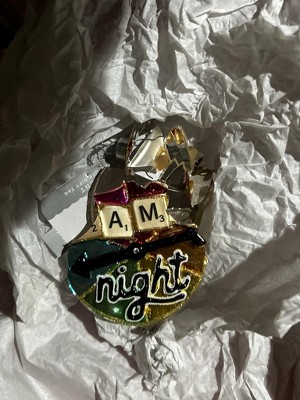 A: The ornament features a multicolor gaming theme with 'Game Night' text and a dangling dice.