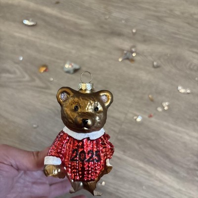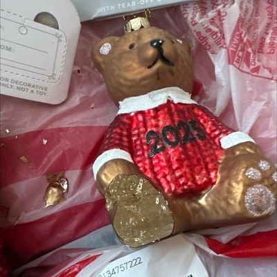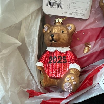 Make your 2025 Christmas memorable and fun by decorating the tree with the Christmas Glass Sweater Bear Ornament from Wondershop™. This Christmas tree ornament features a brown bear wearing a red and white sweater with "2025" text for holiday appeal. Made of glass, the ornament comes with a hanging loop for easy display on the tree.
