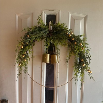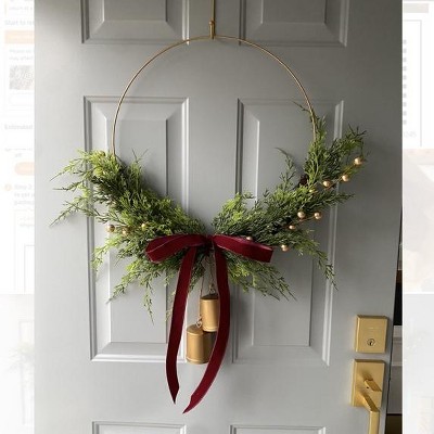Bring a touch of refined elegance to your seasonal decor with this Christmas Hoop Wreath from Wondershop™. This Christmas wreath features faux plant leaves in various shades of green, gold-tone berry branches and two gold-tone bells hanging down. Suitable for indoor use only, you can hang this 22-inch wreath on front doors or windows with the help of a built-in loop.