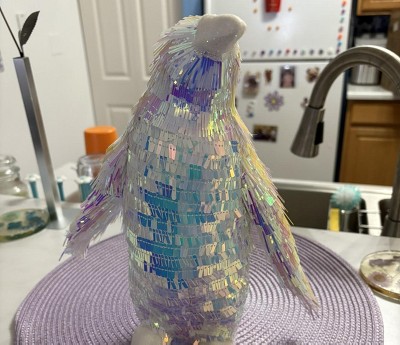Bring a frosty touch of shine and celebration to your decor with this Christmas Iridescent Penguin from Wondershop™. Made from styrofoam, this small Christmas figurine is designed as a standing penguin in an iridescent finish with a layered, fringe-like body for a stunning look. Display it on your mantel or console table or use it as a centerpiece for your dining table to instantly brighten your space with festive shimmer.