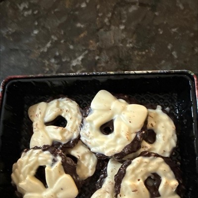 These are delicious. The problem is the presentation: make the stickers easer to peel off, so the tin can be reused. The cookies need to be secured so that they don’t break apart. They are just in one big clump and in pieces.