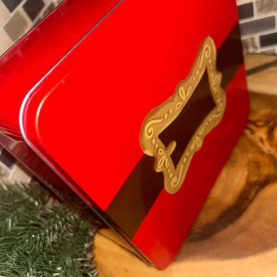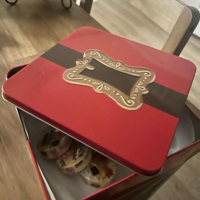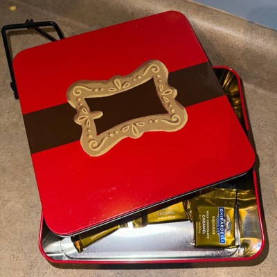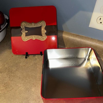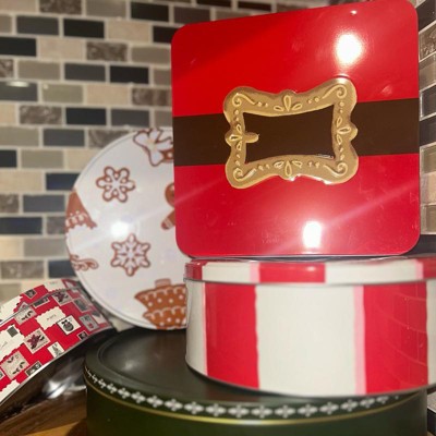 [This review was collected as part of a promotion.] This holiday tin is perfect for edible gifts. It’s good size. It holds plenty. You could easily fit one and a half to two dozen cookies in it. It’s adorable with the Santa belt design on it. Perfect for displaying goodies at your Christmas party. And it’s also perfect to give a gift of cookies, candies or any other sweet treats that you would like to put in it. It’s a good quality tin and I really love it! It's fun and festive!
