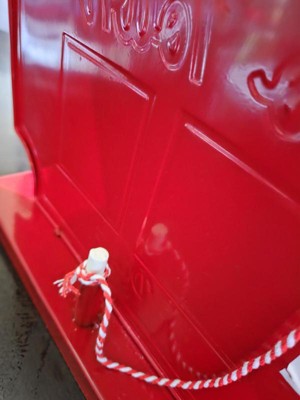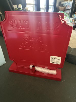 This Santa Claus is coming to town board is really cute. The sign is metal with two chalkboard squares. It includes an attached string with a piece of chalk on the end of it. The chalk can be replaced when used up. There is a little holder is the back to place the chalk piece in. The bottom of the base has a felt pad, so it’s safe to place anywhere. The sign is made really well and seems very durable. My kids are so excited about using this sign. I highly recommend!