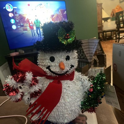 A: Hi, Glam up your home display with this Christmas Tinsel Snowman from Wondershop™. This decorative Christmas piece features a tinsel snowman wearing a dapper accent hat and red scarf while holding a candy cane in one hand and a Christmas tree in the other. The bright hues match the festive Christmas spirit and uses batteries for operation, so you don't need to worry about finding an outlet to plug it into. Set it atop the mantel or an entryway console along with matching tinsel decorations to create a stunning holiday-themed display. - Lima