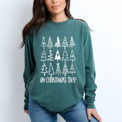 Product Name: Christmas Tree Red Patchwork Print - Women's Garment Dyed Long Sleeve Graphic T-Shirt