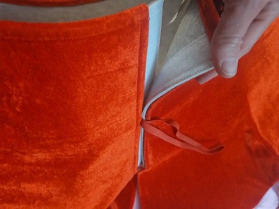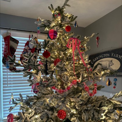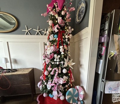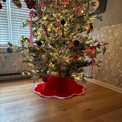 A: The tree stand collar features a scalloped edge in pink satin, adding a festive touch.