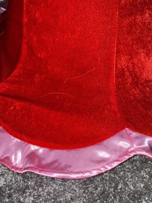 A: The collar is primarily red, accented with pink satin scalloped edges.