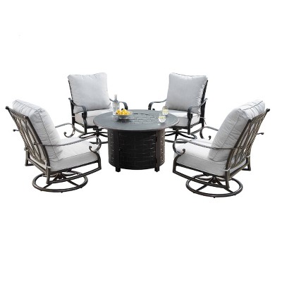Christopher Knight Home 5 Piece Outdoor Patio Fire Pit Conversation Set with 32" Gas Fire Pit Table and Acacia Wood Club Chairs, Teak/ Brown