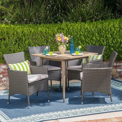 Christopher Knight Home Albury Outdoor Acacia Wood and Wicker 5 Piece Dining Set with Cushion, Light Gray/Gray