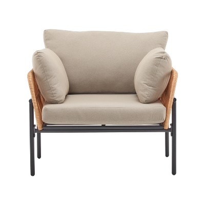 The club chair combines contemporary style with ultimate comfort. Featuring a sleek iron frame and elegant rattan weave accents on the backrest and armrests, this chair brings a touch of sophistication to any outdoor setting. The generously padded, plush cushions offer exceptional support for the seat, back, and arms, ensuring a cozy and relaxing lounging experience. With its spacious design, it provides ample room for extended comfort. Whether you're enjoying a sunny day on the patio or unwinding in the garden, this chair offers the perfect blend of durability, comfort, and style for your outdoor space.