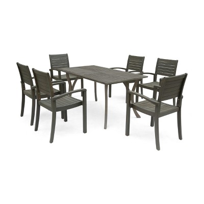 Bring warmth and charm to your outdoor gatherings with this 7-piece rustic dining set. Made from solid acacia wood, it includes a rectangular slatted table and six armchairs that balance comfort with style. With multiple finish options and weather-friendly design, this set is perfect for turning patios, decks, and gardens into an inviting dining retreat for family and friends.