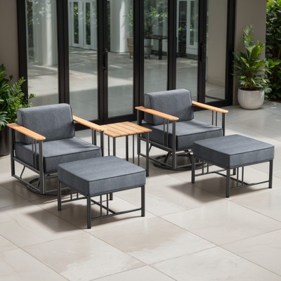 Includes: 2 Arm Chairs, 2 Ottomans, 1 Accent Table